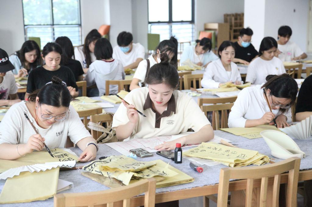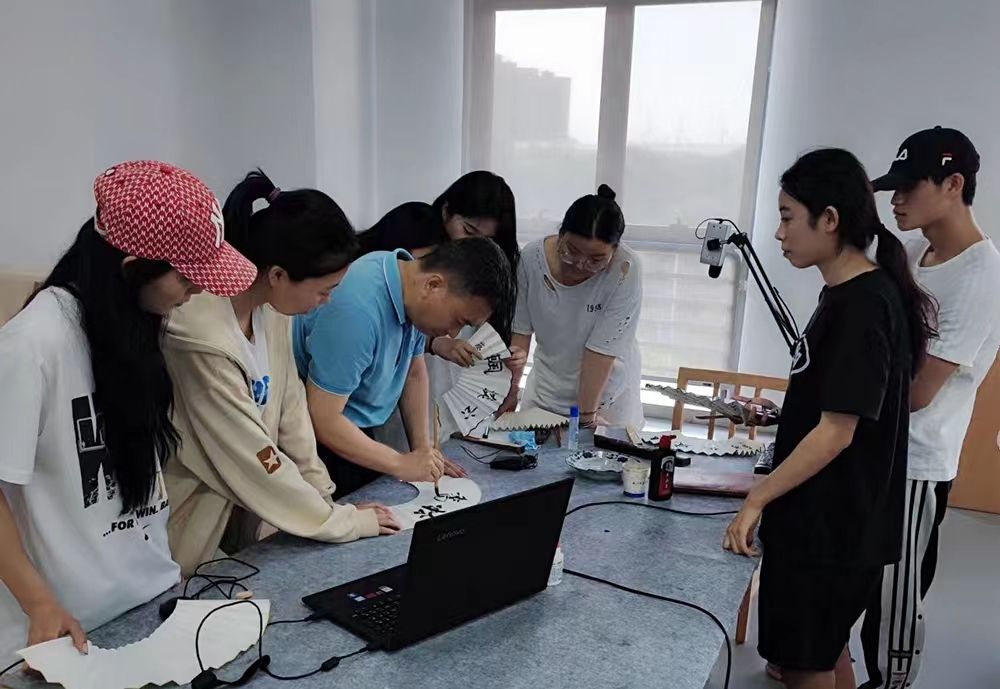 在老师的指导下,同学们完成了一幅幅精美的扇面书法作品。公共艺术教育中心还为本次活动准备了闲章,供学生们钤印,让同学们的扇面书法作品更有艺术感。最后刘丹宁副书记为同学们题字留念,大家沉浸在艺术的海洋之中。
