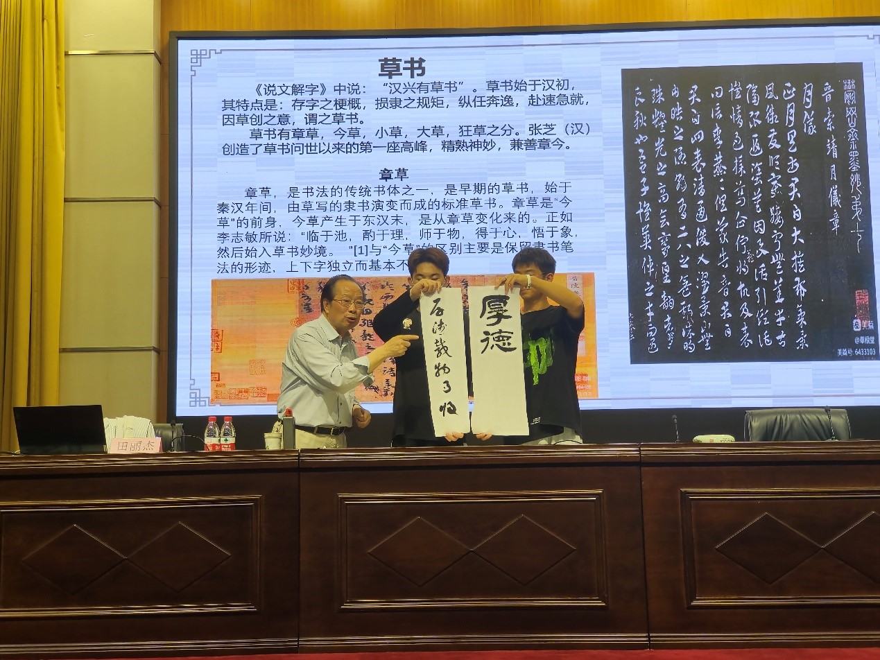 讲座伊始,田丽杰老师讲授了传统文化与书法的关系,从文字的视角为我们解答了什么是传统文化的问题。讲座将传统文化与汉字紧紧联系在一起,用书法传播文化、承载历史。田老师从仓颉造字讲到历朝历代的书体演变,通过各朝代书法名人、名作讲述了文字的发展和书法的传承。他提到,草书是最能体现书法家内心的字体,书为心画,由此抒发书画家胸中酣畅淋漓的审美趣味,并挥毫落纸向学生们演示草书的演变。最后,田老师认真解答了同学们书法学习方面的问题。他现场提笔写下了王维的《山居秋暝》,迎来了同学们的阵阵掌声。
