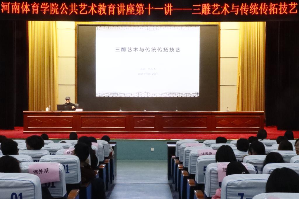 10月29日晚,由我院公共艺术教育中心举办的“艺术人生”专题讲座第十一讲《三雕艺术与传统传拓技艺》在我院学术报告厅举行。本次讲座特邀河南省青年美术家协会副主席、河南省收藏家协会副秘书长巴云飞老师为主讲人,我校近420名师生参加了此次学术活动。