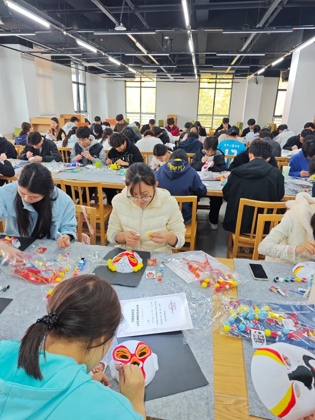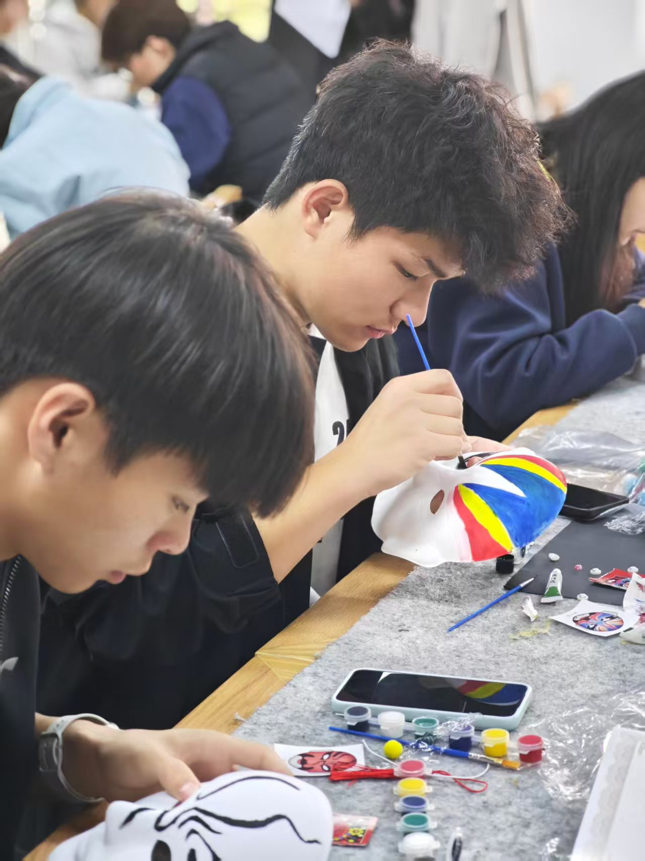 活动现场,同学们围坐长桌,面前摆满了颜料、画笔、空白脸谱与装饰绒球等材料。大家或低头专注勾勒线条,或对照脸谱图谱斟酌色彩搭配,在老师的指导下,将对戏曲角色的理解融入创作 —— 有的同学复刻经典红脸关羽的忠勇脸谱,有的则大胆创新,用撞色与几何图案打造出极具现代感的 “新脸谱”。从整体布局到细节晕染,每一笔都凝聚着对传统艺术的敬畏与对创作的热忱,现场氛围专注而热烈。